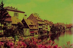 珍しく戦火を逃れた、淡い赤、青、緑、黄とカラフルなおもちゃの様な家並みが続くバンベルク。シラー広場のホフマンの生家や川の中州に建つ旧市庁舎が印象的でした。