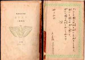 ドイツへの思い入れの最初は、満洲で青春時代を過ごした母が引揚げ時に持ち帰った大切な愛読書に、子供の頃から興味を持ったことかもしれません。ゲーテの小説の断片や詩の数々のアンソロジーで、高橋健二訳・編集、昭和12年発行の本には、呉景槐というサイン入りの写真が挟まれ、中華民国30年(昭和21年)の母への誕生日プレゼントであることが記されています。